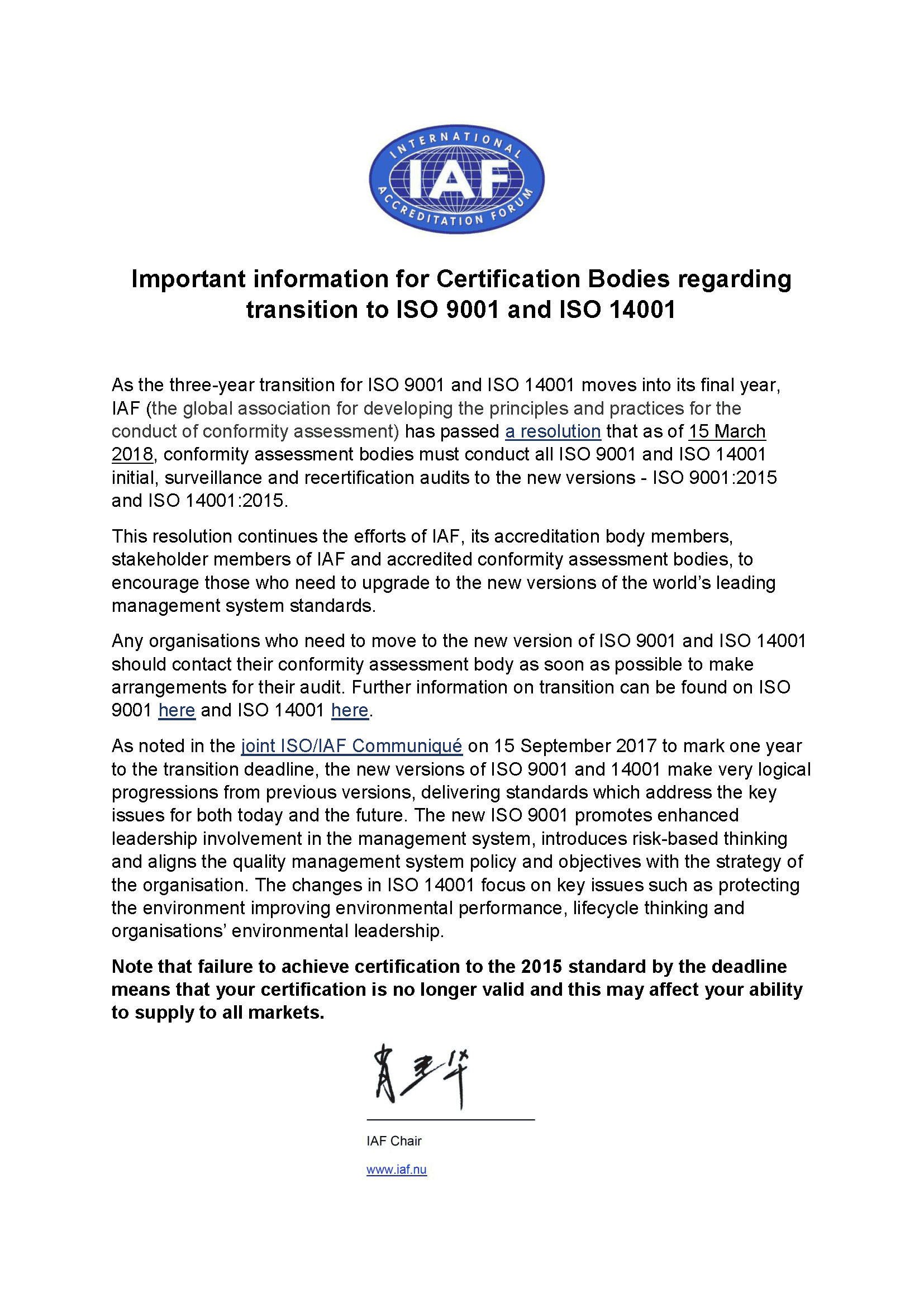 IAF官網(wǎng)發(fā)布了《對認(rèn)證機構(gòu)實施ISO 9001:2015及ISO 14001:2015轉(zhuǎn)版認(rèn)證的重要通告》。要求自2018年的3月15日起,認(rèn)證機構(gòu)對實施的所有ISO 9001及ISO 14001認(rèn)證必須按新版執(zhí)行,包括初次審核、監(jiān)督審核及換證審核。